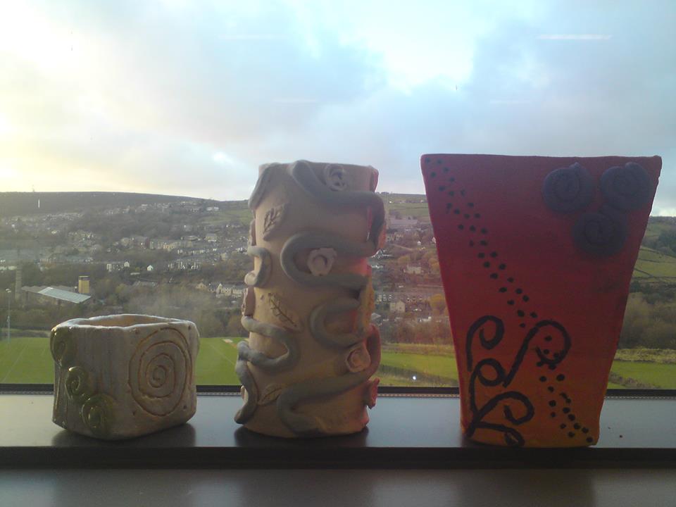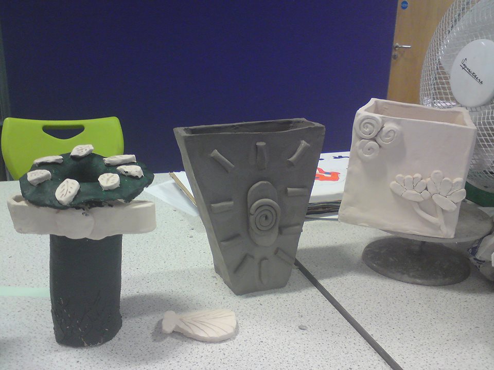 these clay panels are not finished yet… they needs painting,kiln etc.. it will all end up as a set of sepeate panel tiles or a lickle temple,even a box.. following this demo and creation the class and I move onto making clay bowls,using the pottery wheel etc …